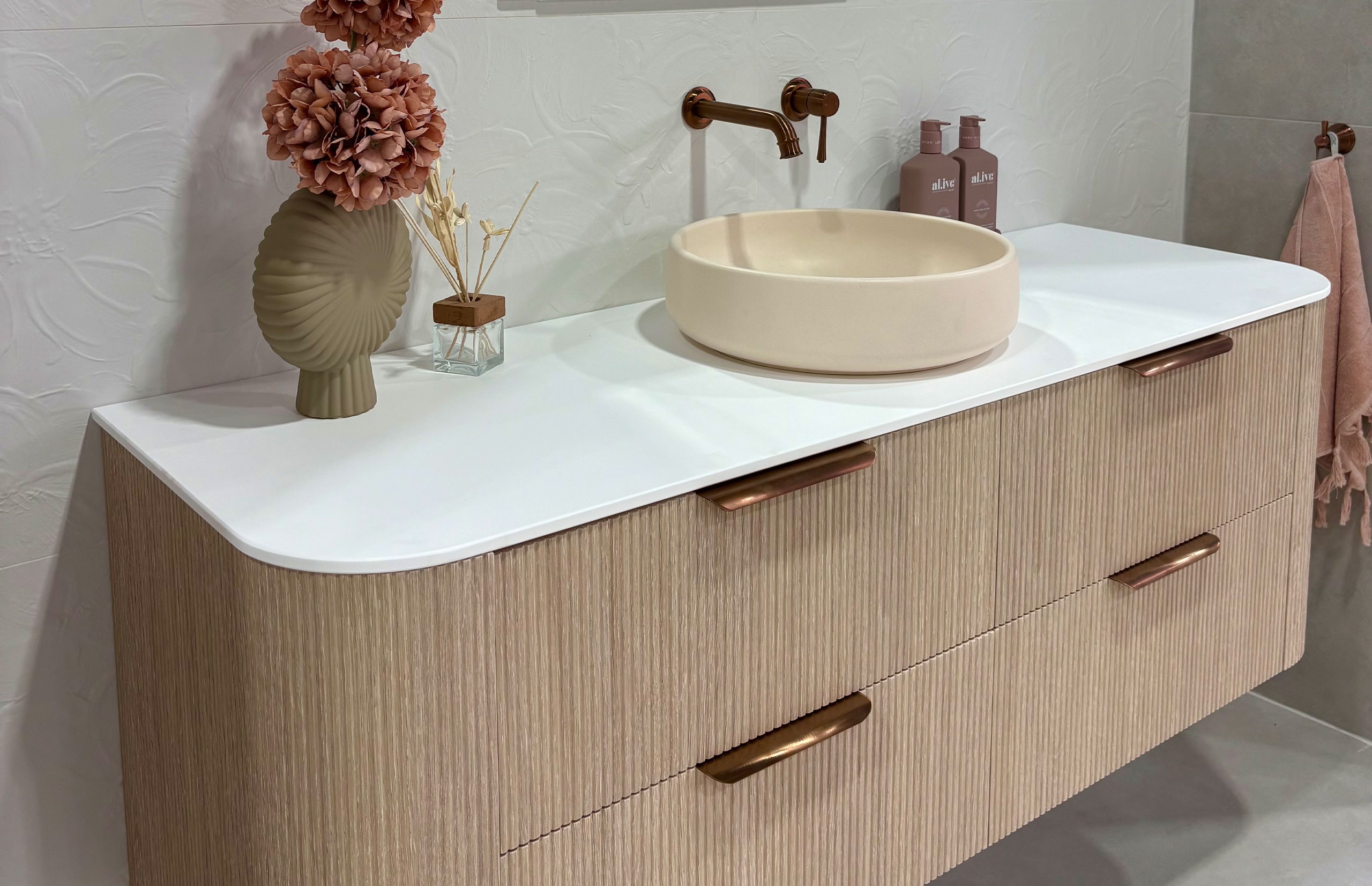At the heart of the design sits the Thirroul vanity, showcasing stunning woodmatt joinery that introduces warmth and natural texture. Paired with the Jean Butter basin in a gentle, warm hue, the palette feels cohesive and inviting. Brushed copper tapware adds a luxurious accent, while the arch overlay mirror above completes the look, tying every element together with softness and balance.